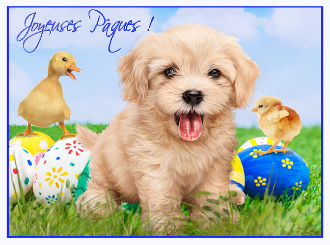 Joyeuses Pâques/ Chiot, oeufs, poussin caneton.