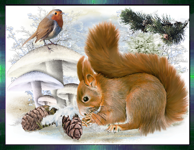 Ecureuil et rouge gorge en hiver.