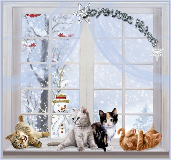 Joyeuses fêtes/ 4 chatons devant une fenêtre.